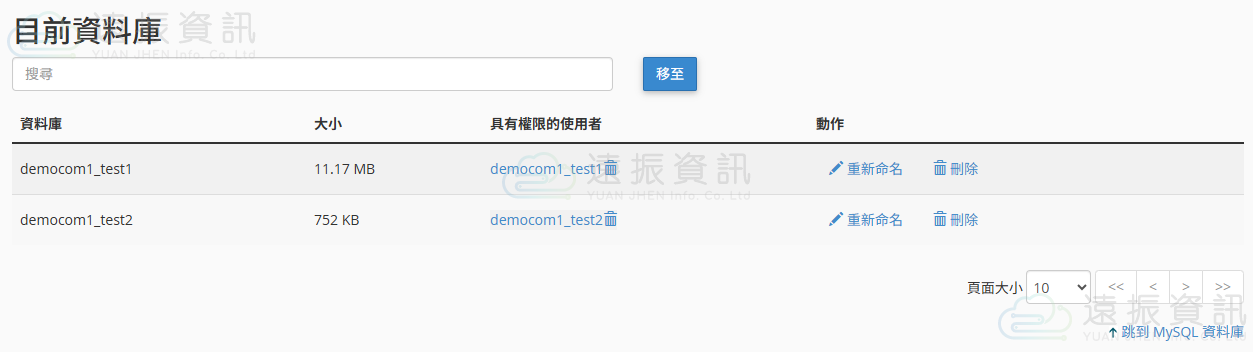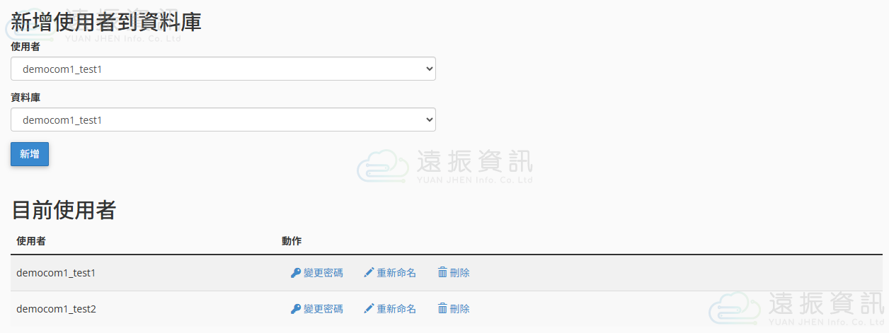 此處可以查看您目前擁有的資料庫,以及對應的綁定使用者,可在此重新命名或刪除資料庫。