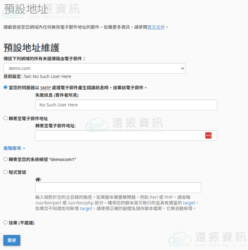 預設地址功能可讓您調整當對方嘗試寄送給一個不存在的電子郵件地址時的處理方式,此部分建議使用 "失敗訊息" 即可。