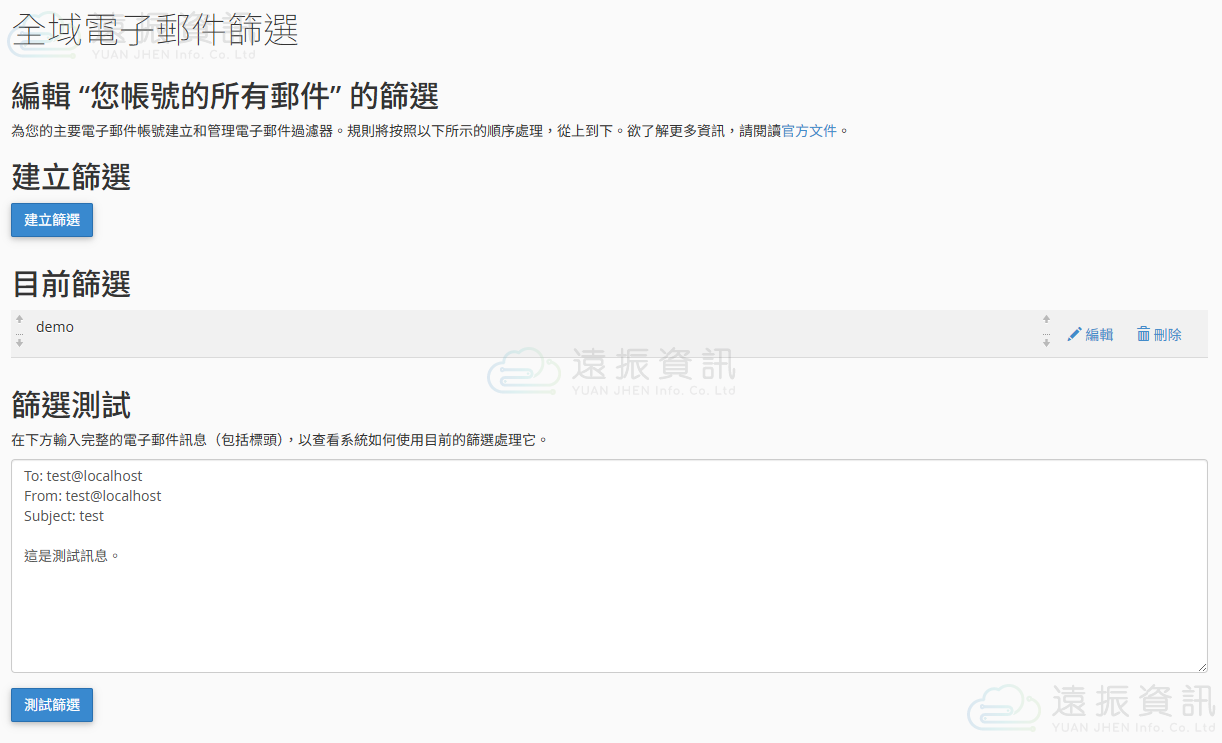 此處可以管理此 cPanel 帳號所有的電子郵件帳號篩選規則