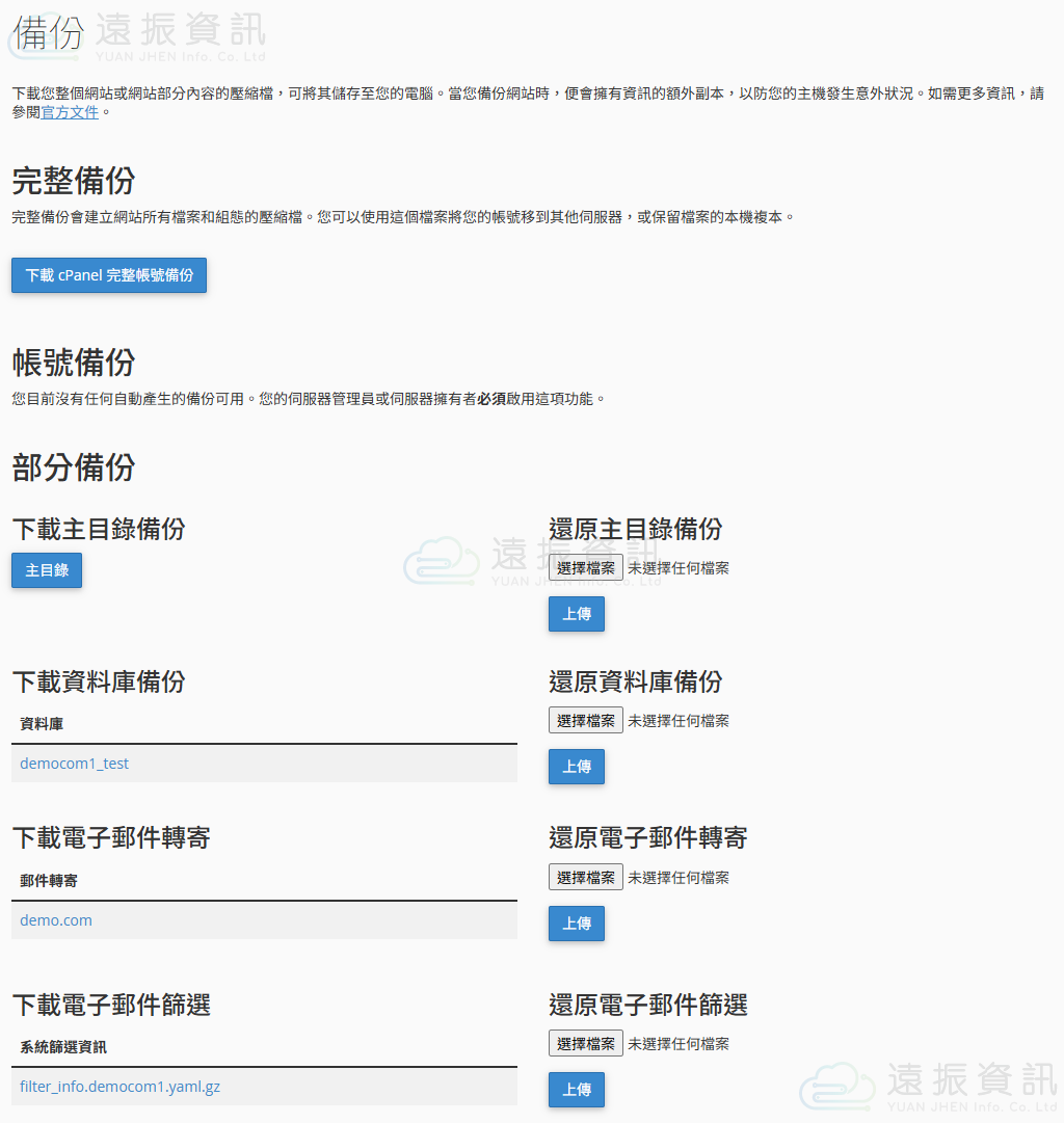 此功能可以讓您快速建立 cPanel 的完整備份檔案,以及相關部分備份檔案。