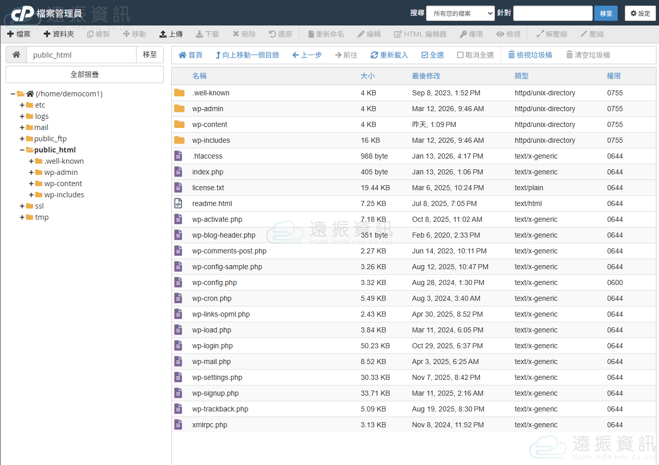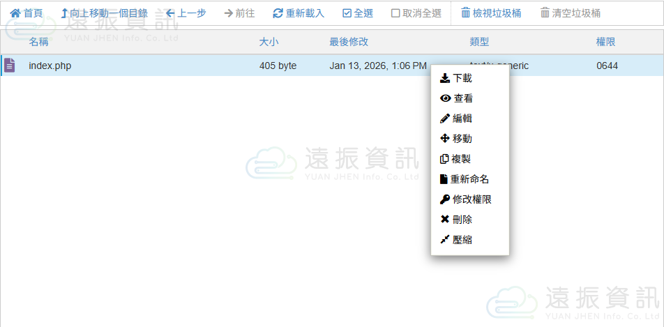 若要使用編輯、刪除、變更權限、壓縮或下載檔案等功能,可點擊上方工具列或選擇檔案後再按右鍵。