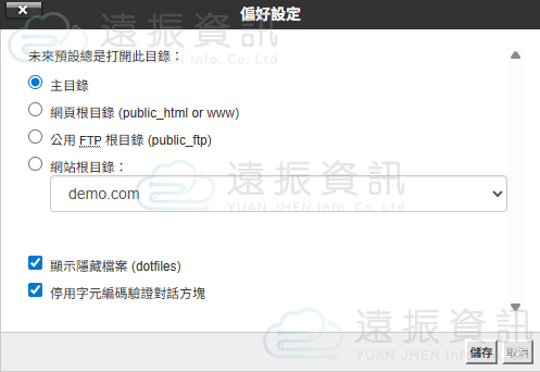cPanel 預設情況不會開啟顯示隱藏檔案,可以透過右上角的 "設定",將 "顯示隱藏檔案" 選項勾選。