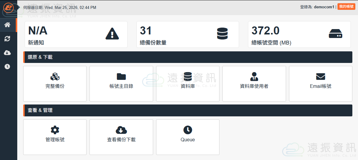 - 完成備份:可將整個帳號完整還原或下載完整備份檔案。