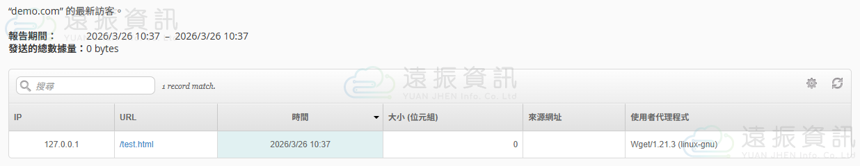 畫面將顯示被瀏覽的網頁路徑、時間、檔案大小以及系統紀錄。