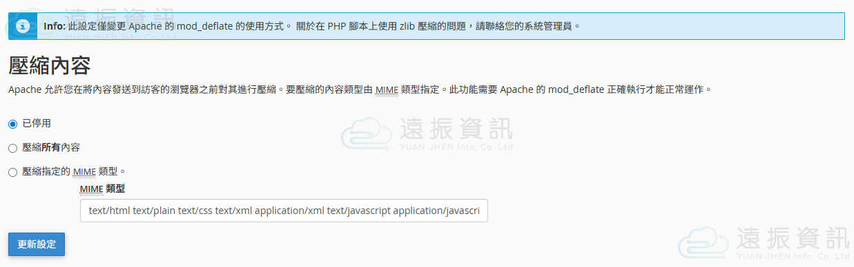 此處可調整網頁伺服器在發送特定資源時是否先進行壓縮,若無特殊需求,建議保持預設設定。